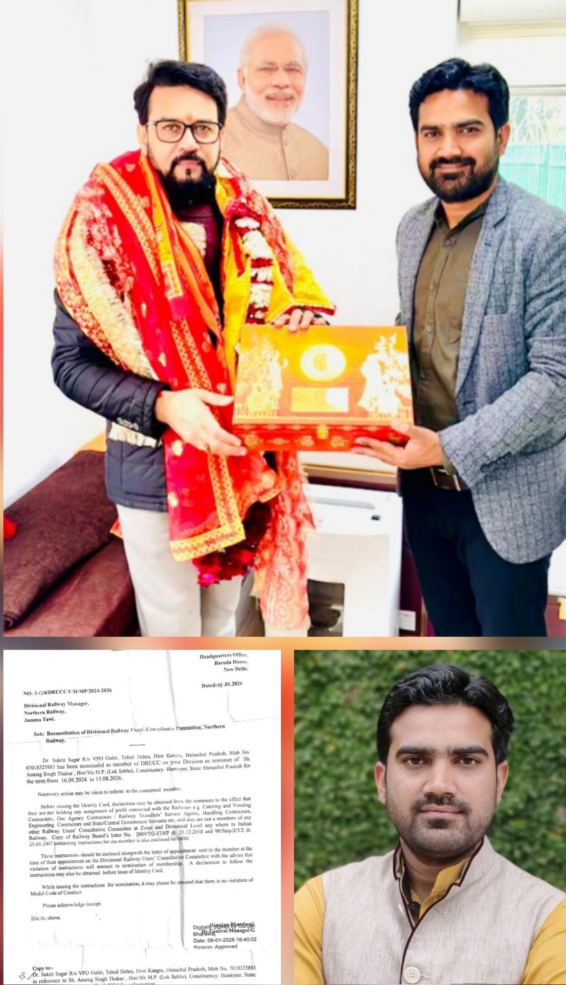 एएम नाथ। देहरा/कांगड़ा : क्षेत्र के लिए गर्व का विषय है कि देहरा विधानसभा के युवा समाजसेवी एवं भाजपा नेता डॉ. सुकृत सागर को मनिस्ट्री ऑफ़ रेलवे, रेलवे बोर्ड नई दिल्ली द्वारा उतरी रेलवे की मंडल स्तरीय सलाहकार समिति DRUCC का सदस्य नामित किया गया है। यह नियुक्ति हमीरपुर के सांसद एवं पूर्व केंद्रीय मंत्री अनुराग ठाकुर की अनुशंसा पर की गई है।