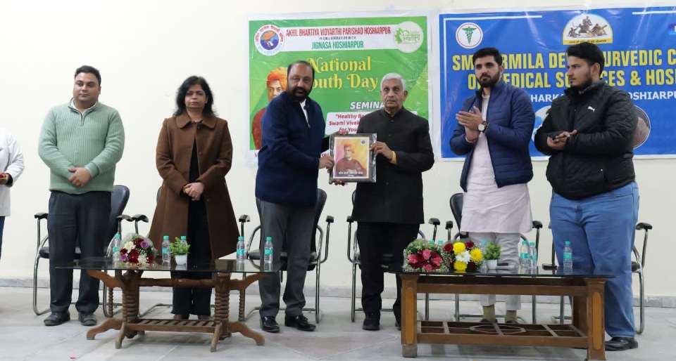 होशियारपुर/दलजीत अज्नोहा :   राष्ट्रीय युवा दिवस के अवसर पर अखिल भारतीय विद्यार्थी परिषद (एबीवीपी) होशियारपुर द्वारा जिज्ञासा होशियारपुर के सहयोग से “स्वस्थ शरीर, निर्भीक मन : स्वामी विवेकानंद और युवा सशक्तिकरण में आयुर्वेद की भूमिका” विषय पर एक प्रेरणादायक संगोष्ठी का आयोजन स्मार्ट. उर्मिला देवी आयुर्वेदिक कॉलेज ऑफ मेडिकल साइंसेज एवं हॉस्पिटल, होशियारपुर में किया