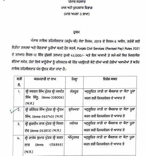 चंडीगढ़ : पंजाब सरकार ने पंजाब नायब तहसीलदार (ग्रुप-बी) सेवा नियम, 2019 के नियम-6 के तहत बड़ा प्रशासनिक फैसला लिया है। इसके अंतर्गत पदोन्नति कोटे की रिक्त पदों पर कानूनगो अधिकारियों को नायब तहसीलदार के पद पर पदोन्नत किया गया है।