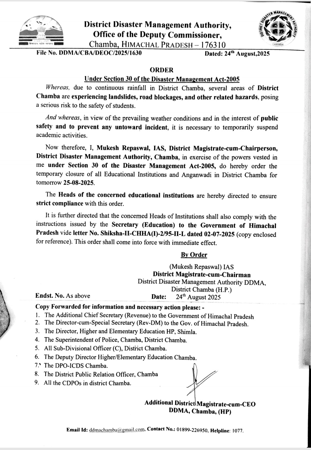 एएम नाथ। चम्बा :  जिला दंडाधिकारी एवं जिला आपदा प्रबंधन प्राधिकरण चम्बा के अध्यक्ष मुकेश रेपसवाल ने सोमवार, 25 अगस्त को जिला चम्बा के सभी शैक्षणिक संस्थानों व आंगनबाड़ी केंद्रों को बंद रखने के आदेश जारी किए हैं।