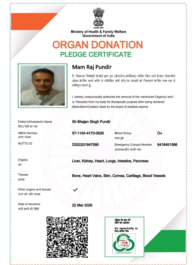 डॉ. पुंडीर ने अपने संदेश में प्रदेशवासियों से भी अंगदान के लिए आगे आने का आग्रह किया। उन्होंने कहा कि अंगदान एक ऐसा महादान है, जिससे हम किसी जरूरतमंद व्यक्ति को नया जीवन दे सकते हैं। उन्होंने बताया कि एक व्यक्ति के अंगदान से आठ लोगों की जान बचाई जा सकती है, इसलिए यह हर व्यक्ति की सामाजिक जिम्मेदारी बनती है कि वह इस दिशा में सकारात्मक कदम उठाए।