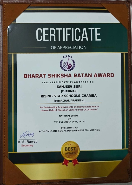 एएम नाथ। चम्बा :  राइजिंग स्टार स्कूल्स के चेयरमैन डॉ. संजीव सूरी को शिक्षा के क्षेत्र में उत्कृष्ट योगदान और उल्लेखनीय उपलब्धियों के लिए प्रतिष्ठित भारत शिक्षा रत्न अवार्ड से सम्मानित किया गया है। यह सम्मान उन्हें दिल्ली में आयोजित नेशनल समिट के दौरान इकोनामिक एंड सोशल डेवलपमेंट फाउंडेशन के सचिव एचएस रावत द्वारा प्रदान किया गया। कार्यक्रम का आयोजन इकोनामिक एंड सोशल डेवलपमेंट फाउंडेशन (इंएसडीएफ) की ओर से 19 दिसंबर को किया गया।