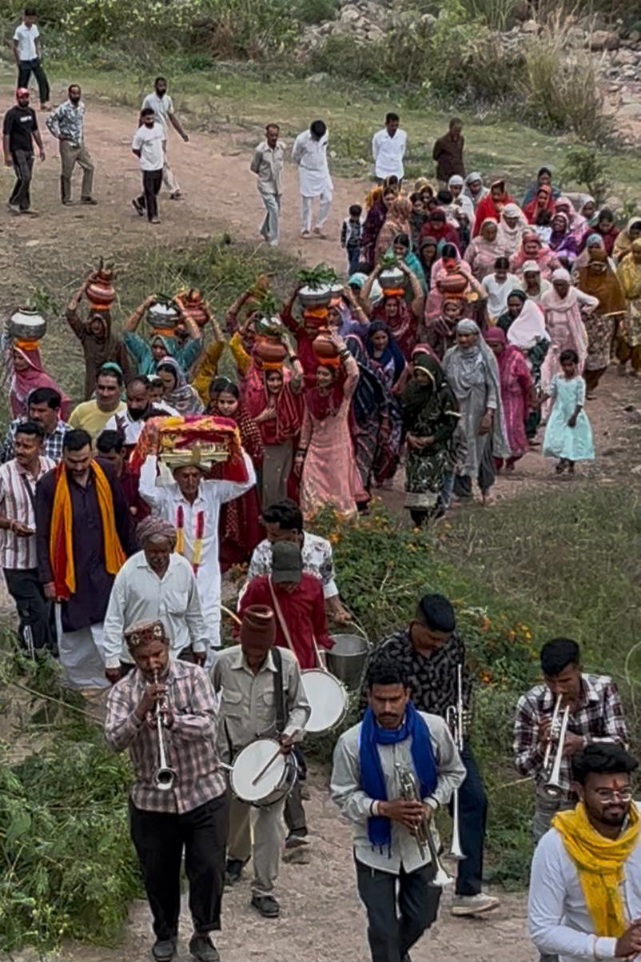 थाना में श्रीमद्भागवत कथा से पूर्व कलश यात्रा निकालते हुए ग्रामीण