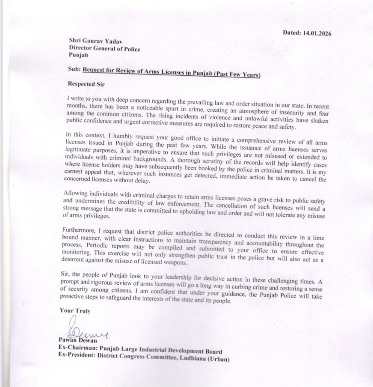 लुधियाना, 14 जनवरी: वरिष्ठ कांग्रेस नेता, लुधियाना कांग्रेस शहरी के पूर्व ज़िला अध्यक्ष और पंजाब लार्ज इंडस्ट्रियल डेवलपमेंट बोर्ड के पूर्व चेयरमैन पवन दीवान ने पंजाब के डायरेक्टर जनरल ऑफ पुलिस (डीजीपी) गौरव यादव से आग्रह किया है कि राज्य में पिछले कुछ वर्षों के दौरान जारी किए गए सभी हथियार लाइसेंसों की विस्तृत समीक्षा करवाई जाए।