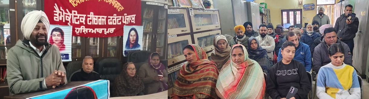 गढ़शंकर, 3 जनवरी : लोकतांत्रिक शिक्षक मोर्चा, मिड डे मील संगठन और डैमोक्रेटिक पेंशनभोगी मोर्चा द्वारा संयुक्त रूप में भारत की प्रथम महिला शिक्षिका बीबी सावित्री बाई फुले की जयंती और उनकी सहकर्मी शिक्षिका बीबी फातिमा शेख की संयुक्त स्मृति में नव वर्ष की चुनौतियों पर एक विचार गोष्ठी का आयोजन किया गया। इसका संयुक्त नेतृत्व डैमोक्रेटिक टीचर्स फ्रंट पंजाब के राज्य प्रचार सचिव सुखदेव डानसीवाल, मिड डे मील वर्कर मनजिंदर कौर और बलजीत कौर ने किया। इस दौरान जसविंदर सिंह, सिमरन कौर, जसविंदर कौर सहित विभिन्न वक्ताओं ने अपने विचार रखे। बिक्कर सिंह, संजीव कुमार पीटीआई, ज्ञान सिंह नूरपुरबेदी और हंसराज गढ़शंकर ने बीबी सावित्री वाई फुले द्वारा बालिका शिक्षा के लिए किए गए प्रयासों की सराहना की और वर्तमान समय में इसके महत्व पर विस्तार से चर्चा की। नेताओं ने कहा कि सावित्री बाई फुले ने अपने पति ज्योतिबा फुले की प्रगतिशील सोच और अपने मित्रों उस्मान शेख और बीबी फातिमा शेख की मदद से लगभग एक सौ अस्सी वर्ष पूर्व एक विद्यालय खोलकर बालिका शिक्षा का मार्ग प्रशस्त किया और हिंदू-मुस्लिम एकता और भाईचारे का संदेश दिया, जो रूढ़िवादियों को बिल्कुल पसंद नहीं आया, जिसके कारण उन्हें भारी कठिनाइयों का सामना करना पड़ा। इस अवसर पर डीटीएफ के नेताओं सुखदेव डांसीवाल, मुकेश कुमार और सतपाल क्लेर ने कहा कि निजीकरण और बाजारीकरण की नीतियों को लागू करने से मौजूदा व्यवस्था श्रमिकों, आम लोगों और महिलाओं को शिक्षा के अधिकार से भी वंचित कर रही है। इस अवसर पर जरनैल सिंह, गुरमेल सिंह, अमरजीत सिंह बंगड़, राजिंदर सिंह, मनजीत सिंह बंगा, इंदरजीत कौर, कृष्णा देवी, राज रानी, कमलेश कौर आदि भी इस चर्चा समूह में शामिल हुए। चर्चा समूह के अंत में, भूमि अधिग्रहण संघर्ष समिति के अध्यक्ष मुकेश मलाउद की दिल्ली रेलवे स्टेशन से गिरफ्तारी और पंजाब सरकार द्वारा पत्रकार के खिलाफ मामला दर्ज करने के विरोध में एक प्रस्ताव पारित किया गया और गिरफ्तार मजदूर नेता की बिना शर्त रिहाई और पत्रकार के खिलाफ दर्ज मामलों को वापस लेने की मांग की गई।