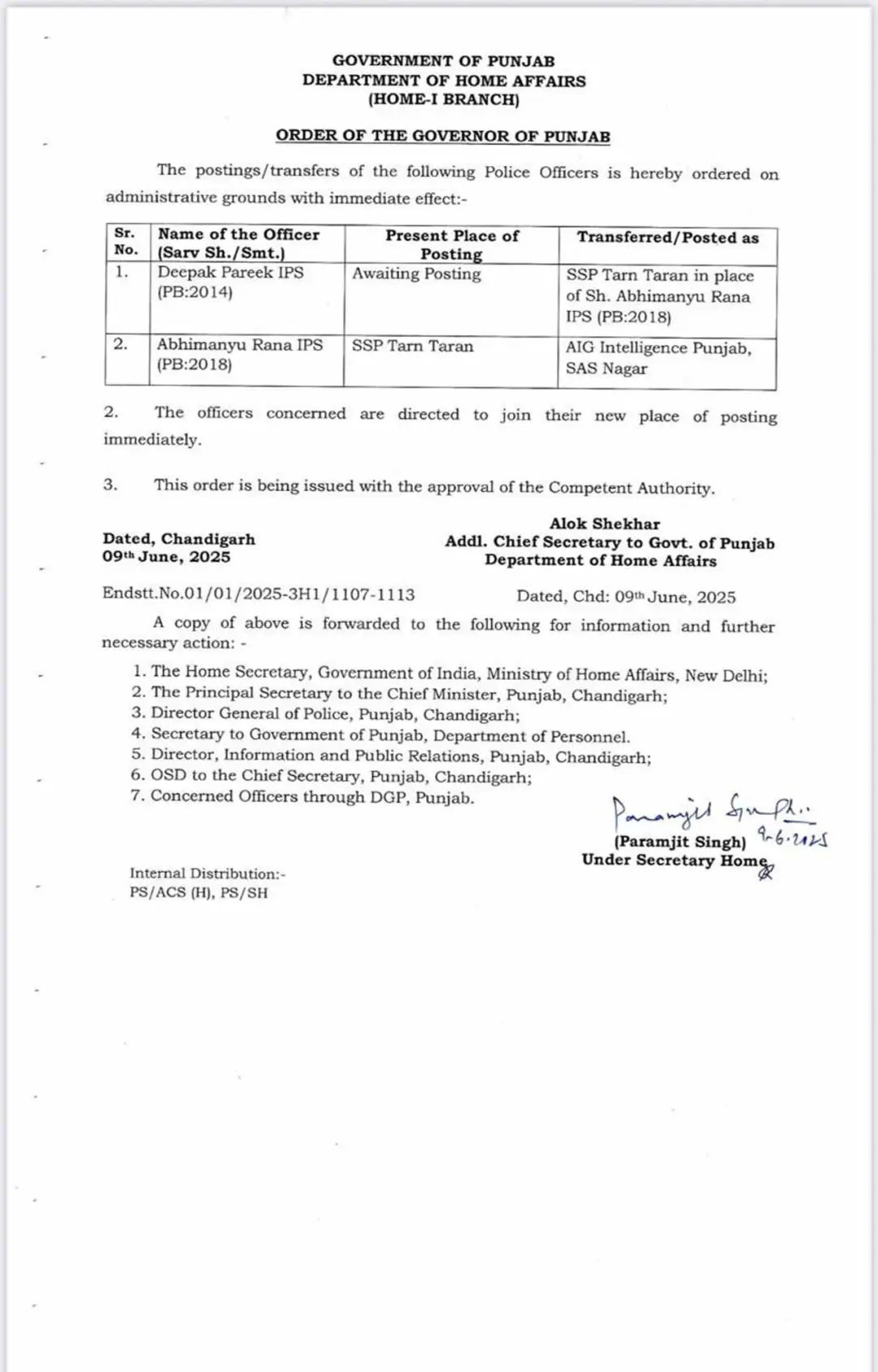 पंजाब में मान सरकार की तरफ से एक बार फिर एक बड़ा प्रशासनिक फेरबदल कर दिया गया है. पंजाब सरकार ने तत्काल प्रभाव से दो IPS अधिकारियों का तबादला कर दिया है। वहीं, तबादला सूची के अनुसार IPS दीपक पारीक तरनतारन के नए SSP व अभिमन्यु राणा को AIG Intelligence के पद पर SAS नगर में तैनात किया गया है।