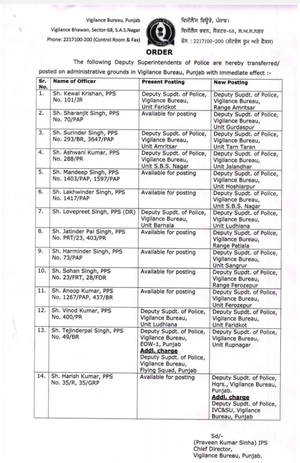 जानकारी के अनुसार, यह आदेश पंजाब के मुख्य निदेशक, प्रवीण कुमार सिन्हा, आईपीएस द्वारा हस्ताक्षरित है। इस आदेश के तहत कई अधिकारी, जो पहले पोस्टिंग के लिए उपलब्ध थे, उन्हें अब सक्रिय इकाइयों में तैनात किया गया है। जिनके नाम इस सूचि में शामिल है।