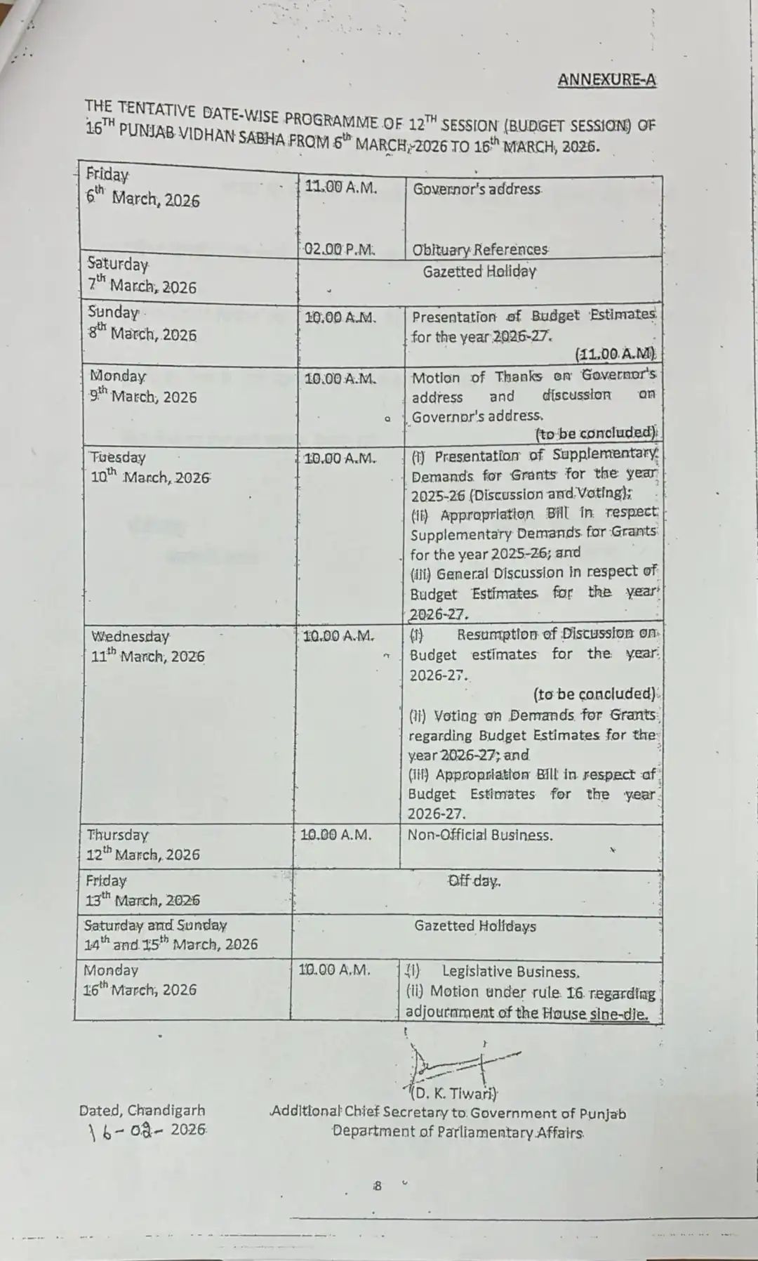 चंडीगढ़: पंजाब विधानसभा के आगामी बजट सत्र कार्यक्रम का शेड्यूल जारी कर दिया है। बता दें कि इस बार सत्र कई मायनों में खास रहने वाला है, क्योंकि राज्य के इतिहास में पहली बार बजट रविवार के दिन पेश किया जाएगा।
