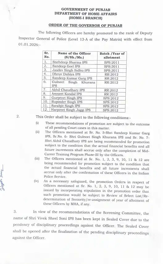 इस फैसले को पुलिस प्रशासन को और अधिक मजबूत तथा प्रभावी बनाने की दिशा में अहम कदम माना जा रहा है। पदोन्नत अधिकारियों को उनके अनुभव और सेवा रिकॉर्ड के आधार पर यह जिम्मेदारी सौंपी गई है। सरकार के इस निर्णय से राज्य में कानून-व्यवस्था को और सुदृढ़ करने में मदद मिलने की उम्मीद है। जिन 12 IPS अधिकारियों को डीआईजी पद पर पदोन्नति मिली है उनकी लिस्ट नीच दी गई है…..