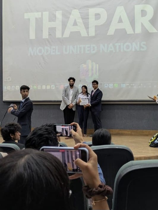 थापर इंस्टीट्यूट ऑफ इंजीनियरिंग एंड टेक्नोलॉजी, पटियाला में आयोजित मॉडल यूनाइटेड नेशन्स (मून) 2026 (सेक्रेटरी जनरल – अंगद गरेवाल एवं डिप्टी सेक्रेटरी जनरल – आयुष्मान ) में “स्पेशल मेंशन” की उपलब्धि प्राप्त की।