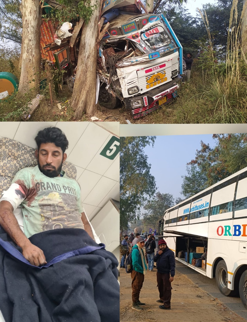 बस और ट्रक में हुई भिड़त में ट्रक चालक गंभीर, बस में स्वार लोग बाल बाल बचे