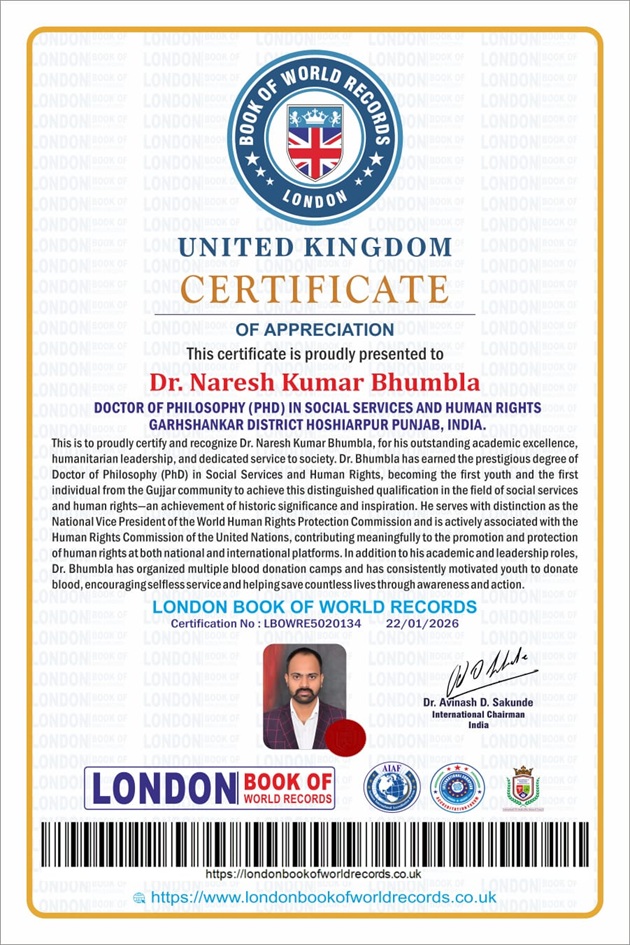 गढ़शंकर। नई दिल्ली में ग्रेट इंडियन पार्लियामेंट अवार्ड 2026 के आयोजित समागम में बुक आफ वर्ल्ड रिकॉर्ड, लंदन द्वारा गढ़शंकर के गांव कंबाला के डॉ. नरेश कुमार भूंबला को यूनाइटेड किंगडम का प्रसंशा पत्र देकर सम्मानित किया गया। यूनाइटेड किंगडम द्वारा दिए प्रसंशा पत्र में लिखा है की डॉ. नरेश कुमार भूंबला गुज्जर कम्युनिटी से सबंधित अकेले व्यक्ति है जिसने छोटे से इंटरनेशनल सत्तर पर मानवाधिकार के लिए काम किया और वर्ल्ड ह्यूमन राइट्स प्रोटेक्शन कमीशन का नेशनल वाईस प्रधान बना ।