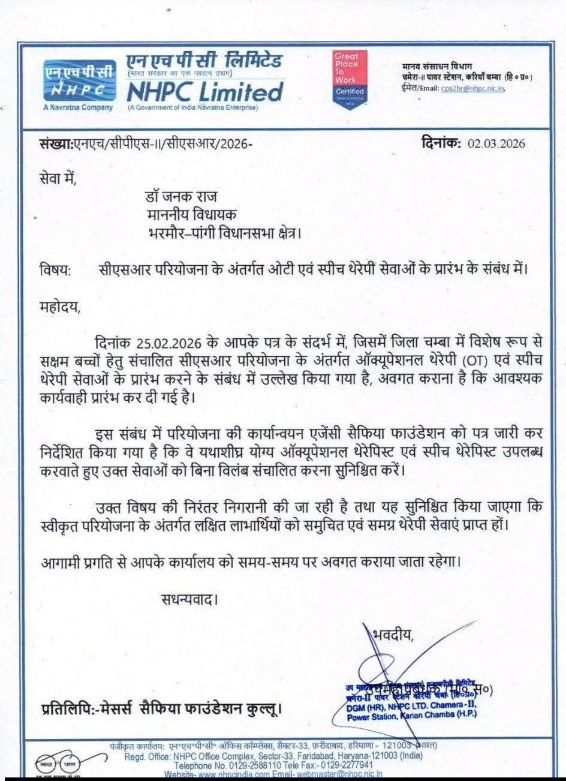 जानकारी के अनुसार, क्षेत्र में लंबे समय से ऐसे बच्चों के लिए विशेष उपचार सुविधाओं की कमी महसूस की जा रही थी, जो शारीरिक, मानसिक या भाषण संबंधी चुनौतियों से जूझ रहे हैं। पहाड़ी और दूरदराज़ भौगोलिक परिस्थितियों के कारण अभिभावकों को अपने बच्चों को जिला मुख्यालय या बड़े शहरों में ले जाना पड़ता था, जिससे समय और आर्थिक बोझ दोनों बढ़ते थे। विधायक डॉ. जनक राज ने इस समस्या को गंभीरता से लेते हुए NHPC प्रबंधन के समक्ष प्रस्ताव रखा और कॉर्पोरेट सामाजिक दायित्व (CSR) के तहत इन सेवाओं को शुरू करने की मांग की।