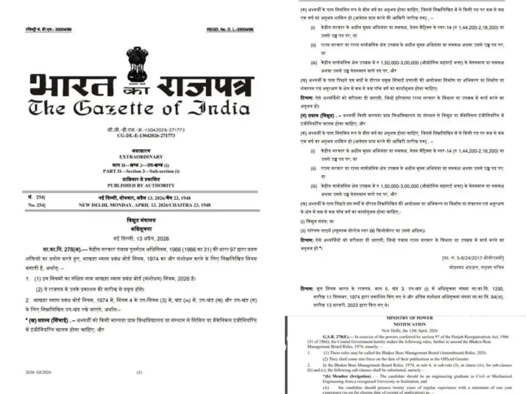 13अप्रैल को जारी हुआ है यह अधिसूचना : सरकार द्वारा जारी नई अधिसूचना के अनुसार अब मेंबर (इरिगेशन) और मेंबर (पावर) पदों पर नियुक्ति किसी भी राज्य के योग्य उम्मीदवारों में से की जा सकती है. हालांकि, इसमें यह भी कहा गया है कि पंजाब और हरियाणा के उम्मीदवारों को प्राथमिकता दी जाएगी, लेकिन यह अनिवार्य नहीं होगा।
