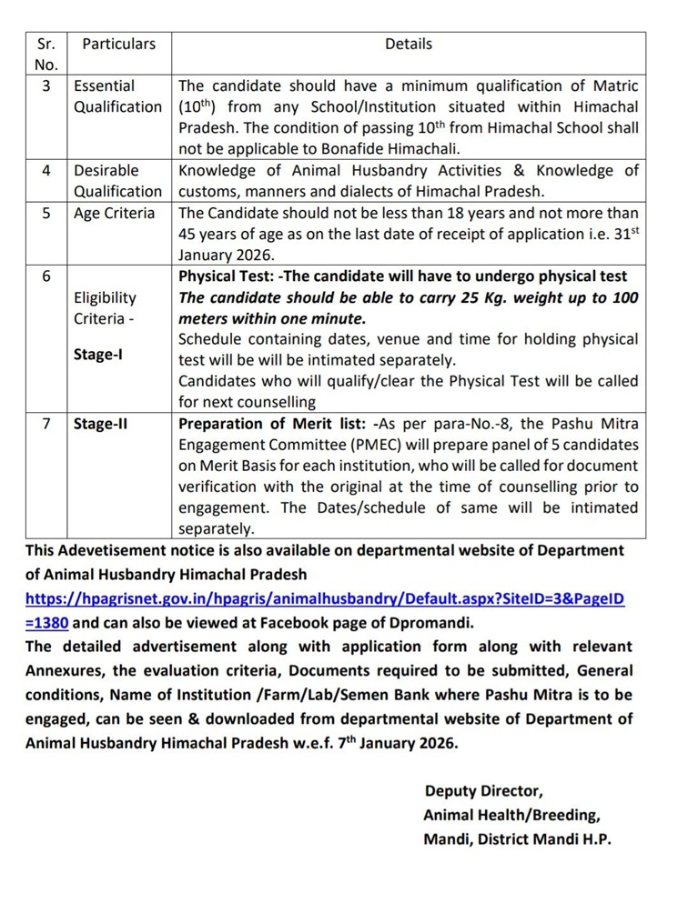 एएम नाथ। मंडी, 7 जनवरी । पशुपालन विभाग मंडी द्वारा जिले के विभिन्न पशु चिकित्सा संस्थानों में मल्टी टास्क वर्कर (पशु मित्र) के 67 पदों को मानदेय आधार पर भरने के लिए पात्र अभ्यर्थियों से आवेदन आमंत्रित किए गए हैं। चयनित पशु मित्रों को 5000 रुपये प्रतिमाह मानदेय पर प्रतिदिन 4 घंटे अंशकालिक सेवाएं देनी होंगी।