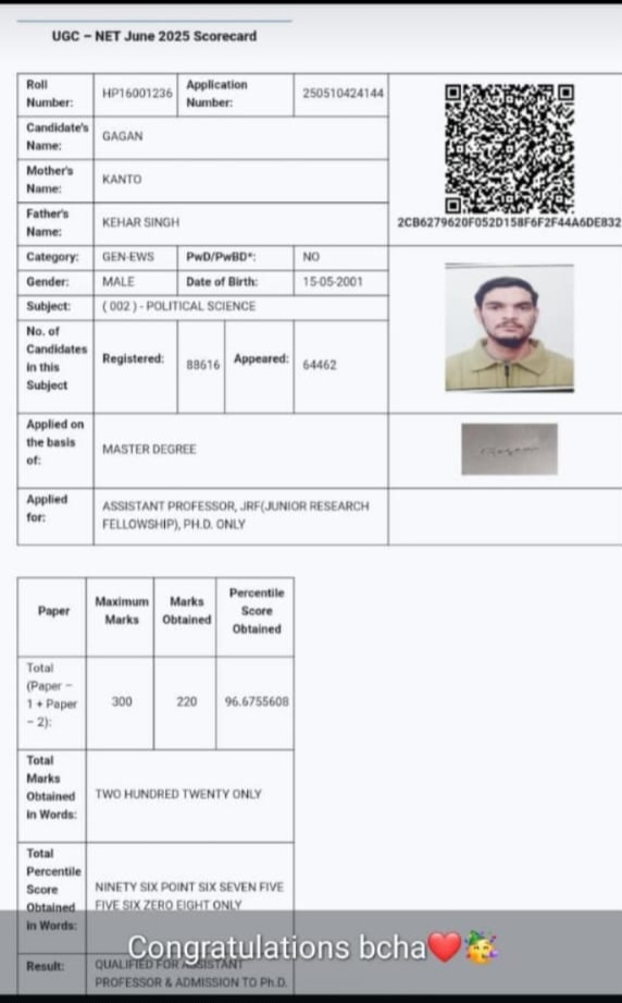 एएम नाथ। चम्बा : हिमाचल प्रदेश के चंबा जिले की पंचायत पलूहीं के एक छोटे से गांव बलियारा के बेटे गगन ने अपनी मेहनत और लगन से बड़ा मुकाम हासिल किया है! गगन ने अपने पहले ही प्रयास में प्रतिष्ठित UGC-NET (राष्ट्रीय पात्रता परीक्षा) में 96% लेकर कर इतिहास रच दिया है!