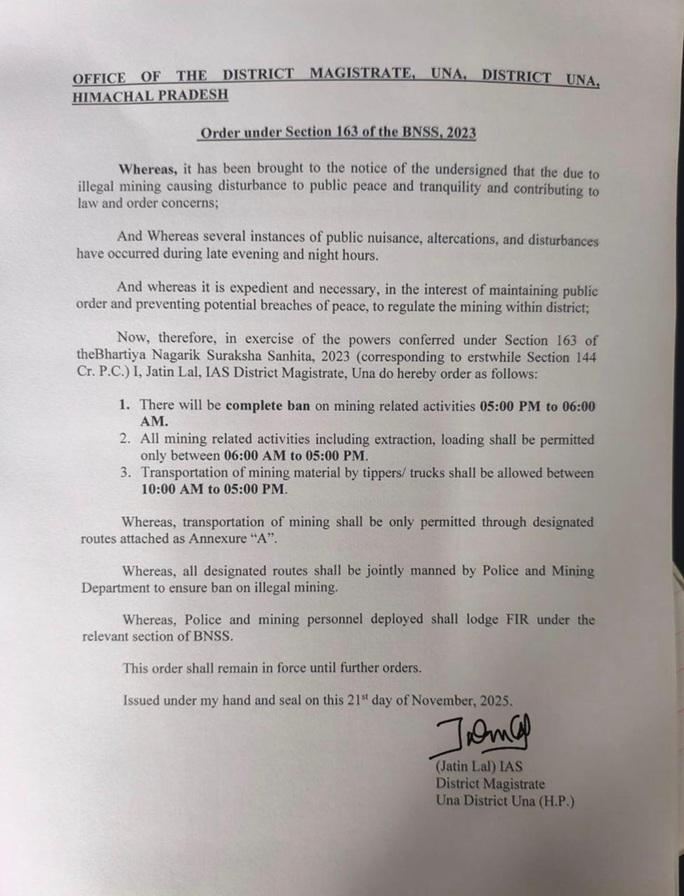 रोहित जसवाल।  ऊना, 21 नवंबर. ऊना जिला प्रशासन ने कानून व्यवस्था की मजबूती के लिए एक और कड़ा कदम उठाते हुए जिले में रात में खनन गतिविधियों पर पूर्ण बैन लगा दिया है। आदेशों का उल्लंघन करने पर संबंधित व्यक्तियों के विरुद्ध तत्काल एफआईआर दर्ज की जाएगी।