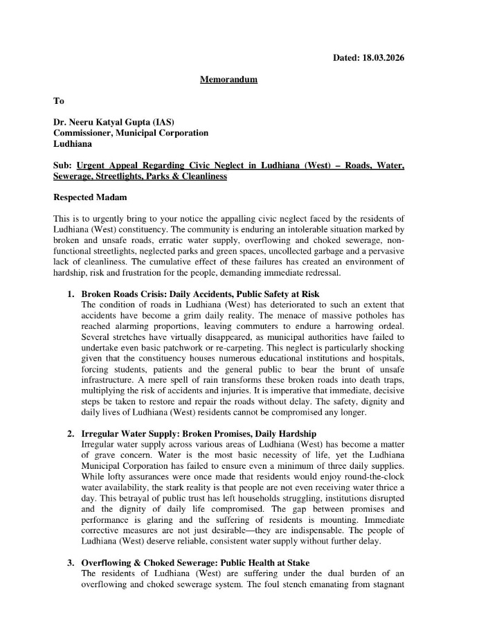 लुधियाना, 18 मार्च: जिला कांग्रेस कमेटी लुधियाना (शहरी) के पूर्व अध्यक्ष और पंजाब लार्ज इंडस्ट्रियल डेवलपमेंट बोर्ड के पूर्व चेयरमैन पवन दीवान ने हलके के विभिन्न वार्डों से कई कांग्रेसी नेताओं के साथ मिलकर नगर निगम लुधियाना की कमिश्नर डॉ. नीरू कत्याल गुप्ता को एक ज्ञापन सौंपा। इस ज्ञापन में लुधियाना (पश्चिम) में गंभीर नागरिक सुविधाओं की अनदेखी को उजागर किया गया है, जहां निवासी टूटी सड़कों, अनियमित पानी की सप्लाई, ओवरफ्लो होते सीवरेज, खराब स्ट्रीट लाइटों, उजड़े हुए पार्कों, न उठाए गए कूड़े और सफाई की भारी कमी जैसी समस्याओं से जूझ रहे हैं।