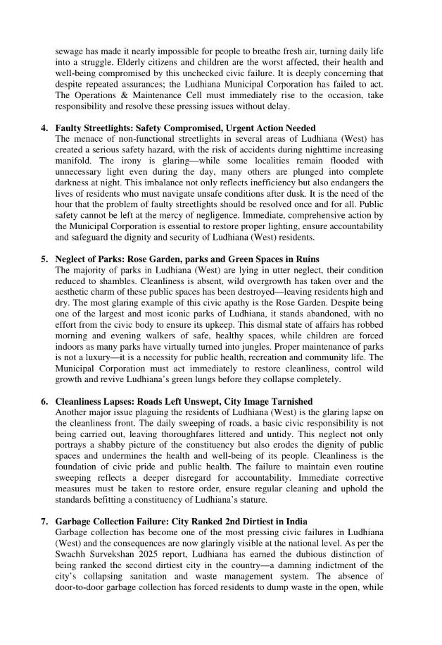 उन्होंने लुधियाना (पश्चिम) के अधिकांश पार्कों की बदहाल स्थिति का जिक्र करते हुए कहा कि ये पूरी तरह उपेक्षित पड़े हैं। यहां सफाई का अभाव है, जंगली घास बढ़ चुकी है और इन सार्वजनिक स्थानों की सुंदरता खत्म हो गई है। सबसे बड़ी मिसाल रोज गार्डन है, जो लुधियाना के सबसे बड़े और प्रसिद्ध पार्कों में से एक है, लेकिन इसे भी बिना देखभाल के छोड़ दिया गया है। इस स्थिति ने लोगों से टहलने के सुरक्षित स्थान छीन लिए हैं और बच्चों को घरों में रहने के लिए मजबूर कर दिया है।