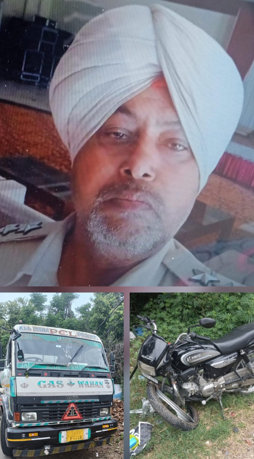 फोटो : मृतक सब इंस्पेक्टर चतविन्दर सिंह की फाइल फोटो  और दुर्घटनाग्रस्त गैस केंटर व मोटरसाइकिल।