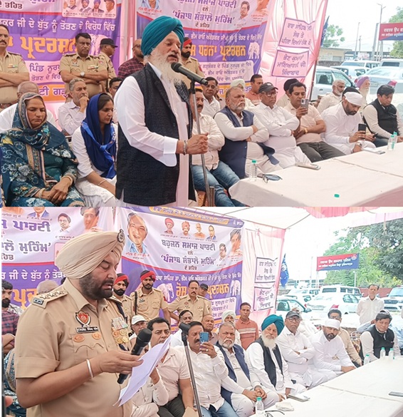 फोटो : बहुजन समाज पार्टी के प्रदेश अध्यक्ष व पूर्व सांसद अवतार सिंह करीमपुरी  धरने में सबोंधित करते हुए और डीएसपी दलजीत सिंह खख आरोपियों को पकड़ने की स्थिति के बारे में अवगत कराते हुए।