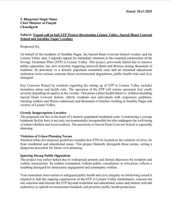 सीनियर कांग्रेस नेता ने मुख्यमंत्री से अपील की है कि सार्वजनिक सेहत और नागरिक अखंडता की रक्षा को देखते हुए एसटीपी के चल रहे कंस्ट्रक्शन को रोकने के लिए उनके तुरंत दखल की ज़रूरत है। उन्होंने मांग की हे कि साइट चुनने का फिर से मूल्यांकन किया जाए और एसटीपी को रिहायशी व शैक्षणिक क्षेत्रों से दूर शिफ्ट किया जाए और संबंधित अधिकारियों को एनवायरनमेंटल स्टैंडर्ड बनाए रखने और सार्वजनिक सेहत की सुरक्षा को प्राथमिकता देने का निर्देश दिया जाए।