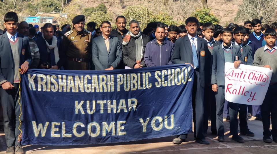 पट्टा मेहलोग, 22 जनवरी (तारा) :  कसौली व कुठाड़ पुलिस की ओर से कृष्णगढ़ पंचायत में नशा मुक्ति अभियान को आगे बढ़ाते हुए एक जन जागरूकता व जन चेतना रैली का आयोजन नायब तहसीलदार कृष्णगढ़ सूरत सिंह व पुलिस थाना प्रभारी कसौली गोपाल सिंह के नेतृत्व में किया गया।इस रैली में स्थानीय पंचायत प्रतिनिधियों के इलावा कृष्णगढ़ पब्लिक स्कूल,आई, टी, आई व राजकीय वरिष्ठ माध्यमिक विद्यालय कुठाड़ के छात्रों ने भाग लिया।