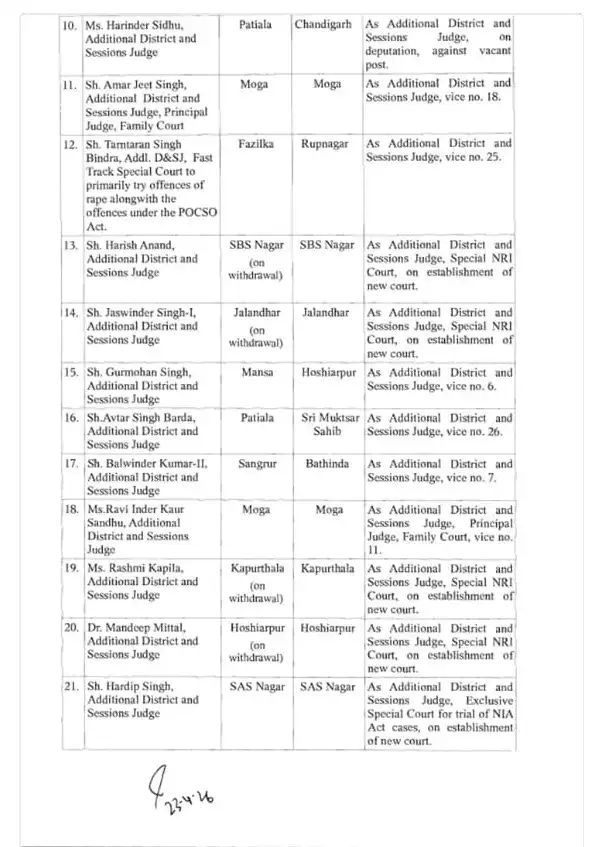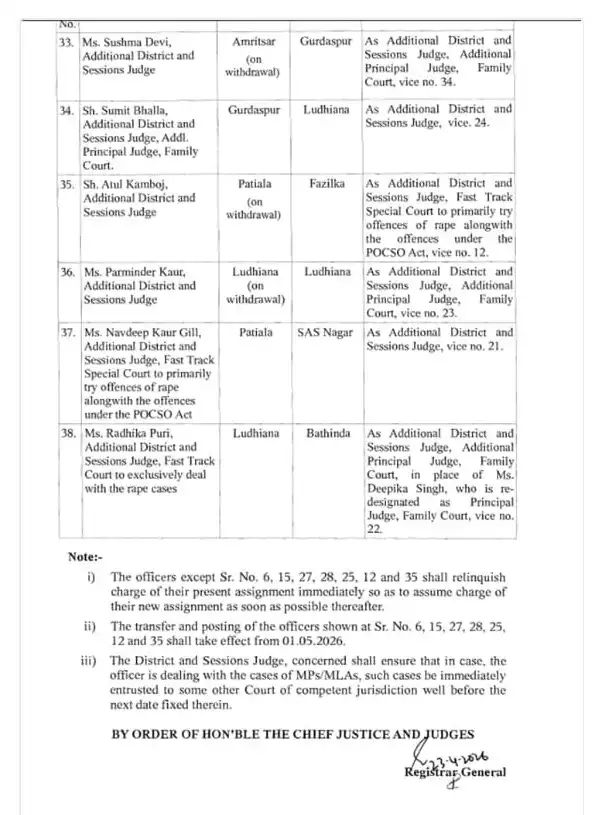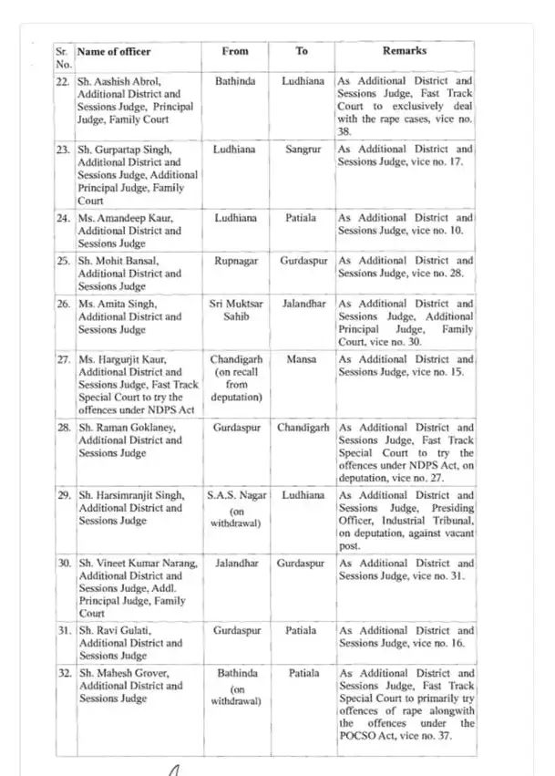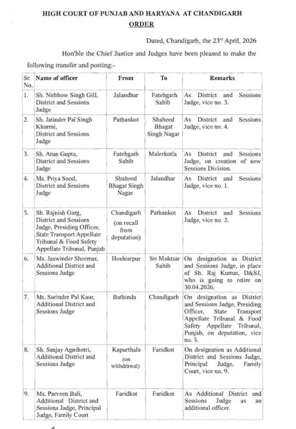 हाई कोर्ट के नए आदेशों के तहत फतेहगढ़ साहिब में तैनात अरुण गुप्ता को मालेरकोटला का पहला जिला एवं सत्र न्यायाधीश नियुक्त किया गया है। अब तक मालेरकोटला न्यायिक रूप से अन्य जिले पर निर्भर था, लेकिन इस फैसले के बाद वहां स्वतंत्र सत्र मंडल कार्य करेगा। इसी कड़ी में जालंधर के जिला एवं सत्र न्यायाधीश निर्भव सिंह गिल को अब फतेहगढ़ साहिब की जिम्मेदारी सौंपी गई है। वहीं, शहीद भगत सिंह नगर की जिला एवं सत्र न्यायाधीश प्रिया सूद को जालंधर भेजा गया है।