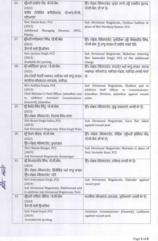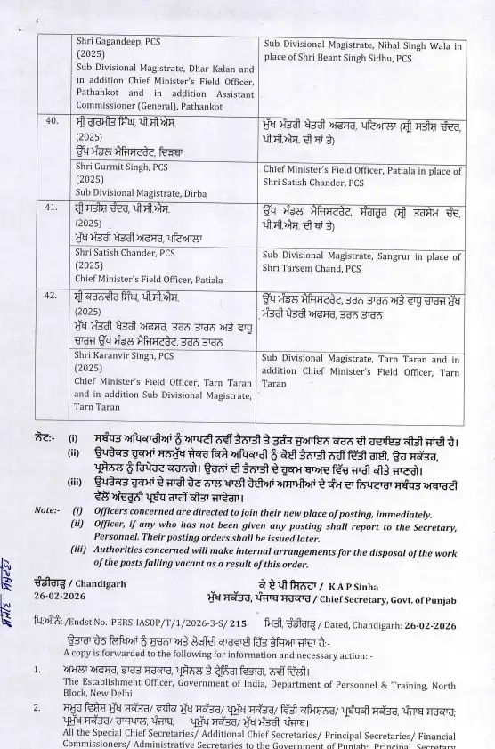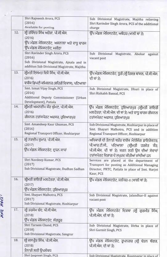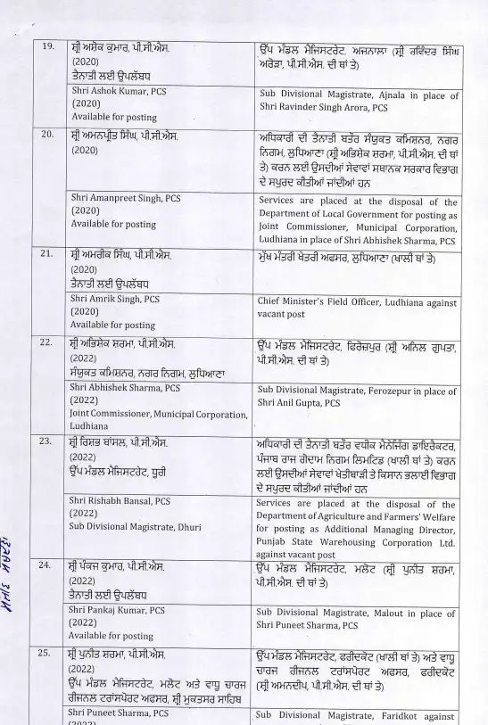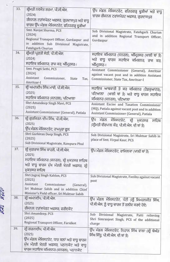 इस फेरबदल में कई उच्च पदस्थ अधिकारी शामिल हैं, जो विभिन्न विभागों में अपनी नई जिम्मेदारियों को संभालेंगे। अधिकारियों के स्थानांतरण से यह उम्मीद जताई जा रही है कि पंजाब में प्रशासनिक कामकाज को और अधिक प्रभावी और पारदर्शी तरीके से चलाया जा सकेगा। इस कदम का उद्देश्य सरकारी कामकाजी प्रणाली में सुधार और बेहतर प्रशासन प्रदान करना है। जिन अधिकारियों का ट्रांसफर किया गया है।