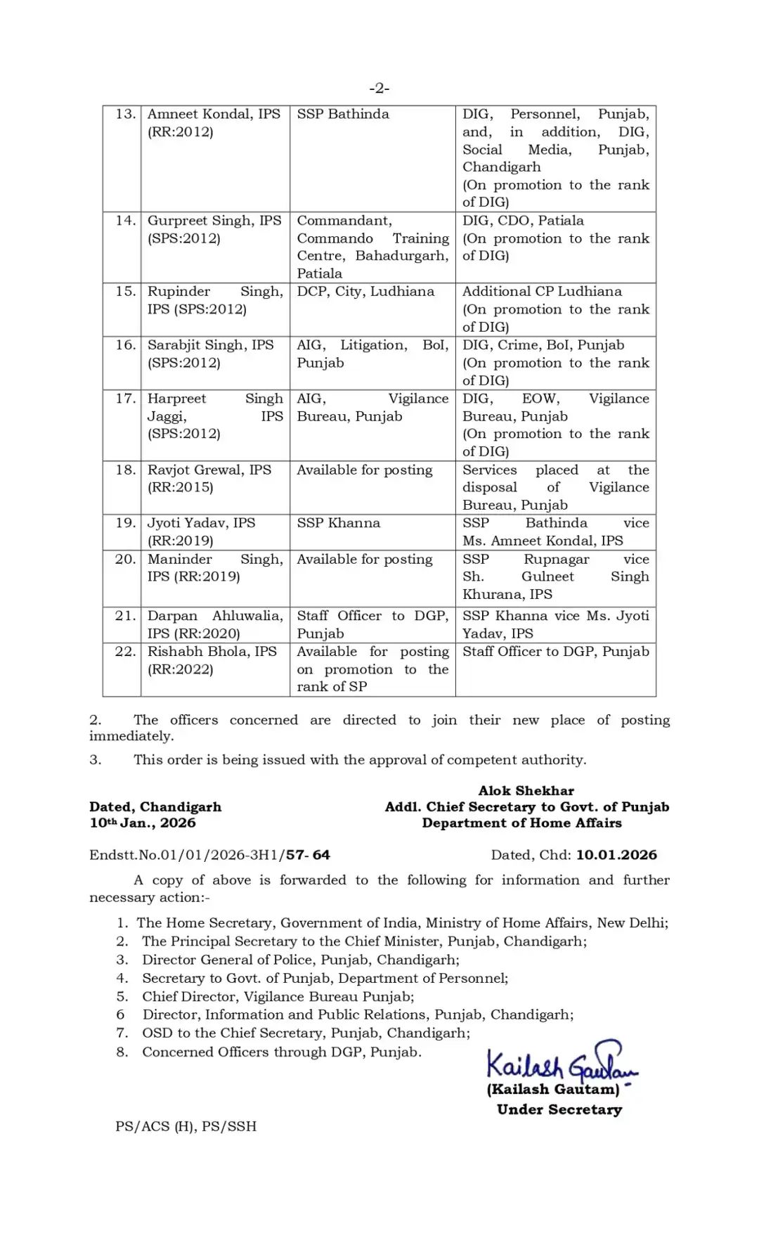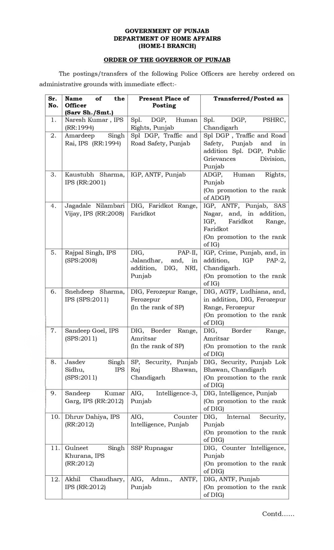 इसी तरह सनेहदीप शर्मा, संदीप गोयल, जसदेव सिंह सिद्धू, संदीप कुमार गर्ग, ध्रुव दहिया, गुलनीत सिंह खुराना, अखिल चौधरी, अमनीत कोंडल, गुरप्रीत सिंह, रुपिंदर सिंह, सरबजीत सिंह, हरप्रीत सिंह जग्गी और अन्य अधिकारियों के पद और रैंक में भी महत्वपूर्ण परिवर्तन किए गए हैं।