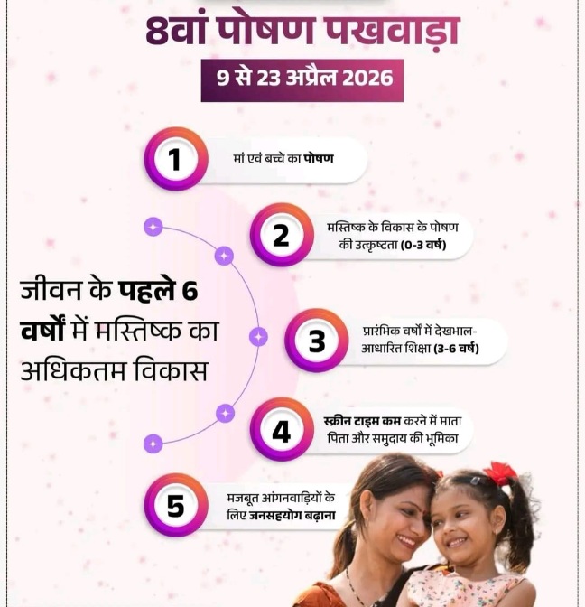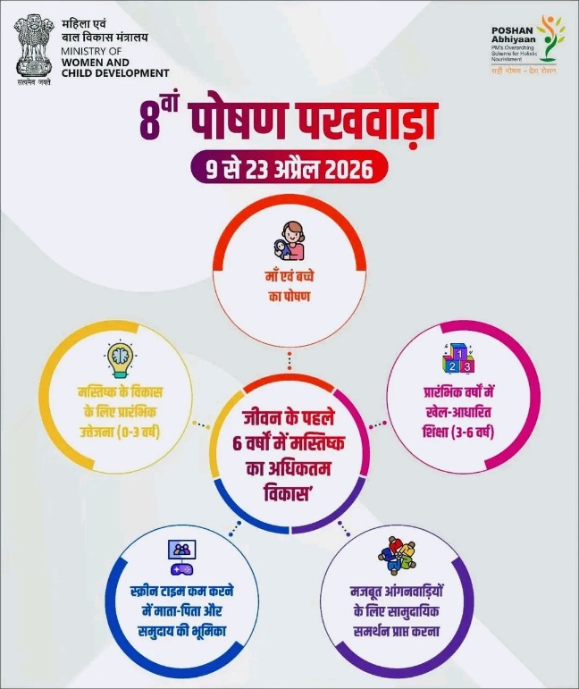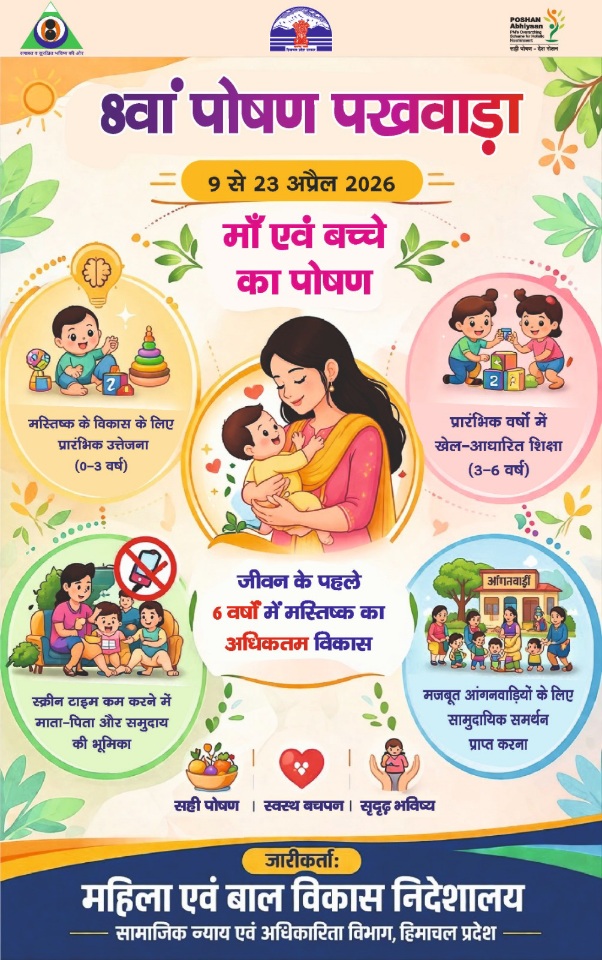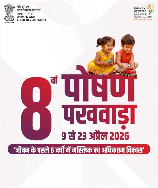 एएम नाथ। चम्बा :  महिला एवं बाल विकास मंत्रालय द्वारा 9 से 23 अप्रैल 2026 तक देशभर में 8वां पोषण पखवाड़ा मनाया जा रहा है। इस वर्ष का मुख्य विषय “जीवन के पहले छह वर्षों में मस्तिष्क के विकास को अधिकतम करना” रखा गया है, जो बच्चों के समग्र मानसिक और शारीरिक विकास पर केंद्रित है। इस अभियान का मुख्य उद्देश्य कुपोषण मुक्त भारत की दिशा में समुदाय स्तर पर पोषण के प्रति जागरूकता बढ़ाना है।