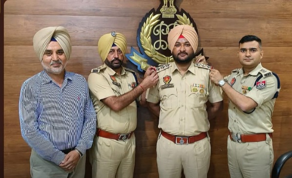 Hoshiarpur / Daljeet Ajnoha/August 04 : Sub-Inspector Harpreet Singh of the Punjab Police has been promoted to the rank of Inspector. On this special occasion, SSP Sandeep Kumar Malik and SP PBI Major Singh ceremoniously pinned the star on his uniform.