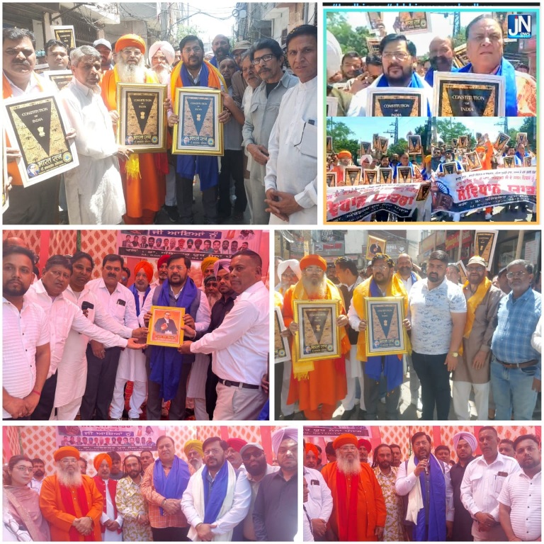 Ludhiana/Daljeet Ajnoha/April 13 : Hundreds of activists from the Dr. Ambedkar Youth Sena, Punjab, organized a ‘Constitution March’ to convey a message of equality and unity to the public. Dedicated to the birth anniversary of Dr. Ambedkar, the Constitution March was organized in the Ludhiana Central Assembly constituency—commencing from the local Cheema Chowk—under the leadership of President Raj Kumar Happy, Vice President Ashwani Kumar Makhan, and Secretary Pappu Khan. The event was graced by the presence of distinguished guests, including the revered Saint Surinder Das Ji (from Charan Chhoh Ganga, Khuralgarh Sahib), and Shri Rajesh Bagha Ji—former Chairman of the Punjab State Scheduled Castes Commission, Vice President of BJP Punjab, and All-India President of the British Ravidasia Heritage Foundation. Other prominent figures who arrived to lend their support included ‘Pasle Wali Sarkar’ Sai Jasvir Ji, former Minister Bharat Bhushan Ashu, Shri Gurdev Sharma Debi (Cashier, BJP Punjab) from the Ludhiana Central constituency, Jasbir Singh Jassi (President, Bahujan Samaj Party), former Councilor Raja, and Navneet Ghayal. In his address, Rajesh Bagha emphasized that the Indian Constitution establishes unity and equality within society and serves to strengthen mutual bonds of brotherhood. Also present on this occasion were Surinder Kaur Kainth (President, Mahila Congress Committee), Firoz Master, Saddam Siddiqui, Bablu Khan, Rajinder Kainth, Kapil Kumar, Kala Basra, Rahul Kumar, Gagan Barwale, Ruchi Pahuja, and others.