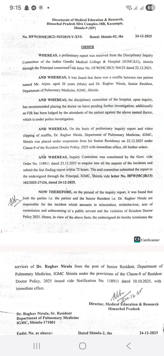 निदेशालय चिकित्सा शिक्षा एवं अनुसंधान (DMER), हिमाचल प्रदेश ने पल्मोनरी मेडिसिन विभाग के सीनियर रेजिडेंट डॉ. राघव निरुला की सेवाएं तत्काल प्रभाव से समाप्त कर दी हैं।