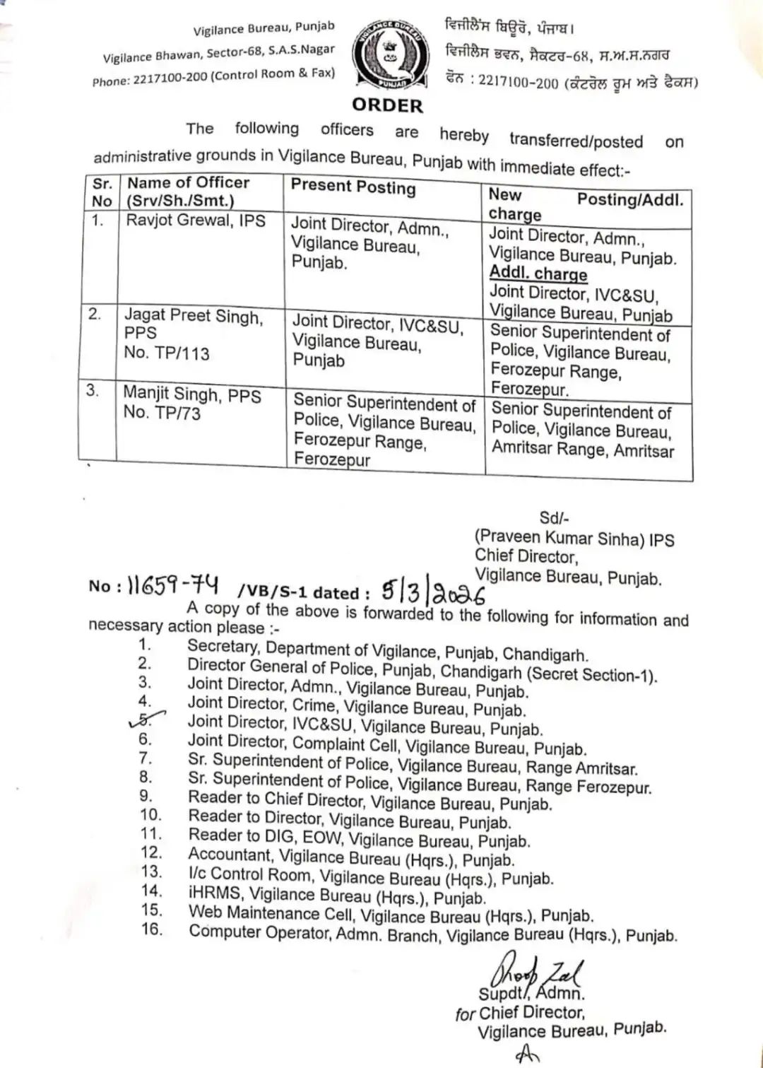 इसके अलावा, पीपीएस अधिकारी Manjit Singh को विजिलेंस ब्यूरो फिरोजपुर रेंज से स्थानांतरित कर अमृतसर रेंज में सीनियर सुपरिटेंडेंट ऑफ पुलिस (एसएसपी) के पद पर तैनात किया गया है। यह आदेश विजिलेंस ब्यूरो पंजाब के चीफ डायरेक्टर Praveen Kumar Sinha द्वारा जारी किए गए हैं। अधिकारियों को निर्देश दिया गया है कि वे अपने नए पदों का कार्यभार तुरंत संभालें।