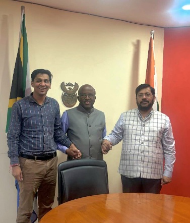 New Delhi/Daljeet Ajnoha/Mar.20 : A productive meeting was held with Counselor Mr. Sedula Mashudubele Mamabolo at the South African Embassy (South African High Commission) located in New Delhi. Present at this meeting were Mr. Rajesh Bagha—former Chairman of the Punjab State Scheduled Castes Commission, Vice President of BJP Punjab (India), Chief Patron of the Pathway Global Alliance, and National President of the Indian Chapter of the British Ravidasia Heritage Foundation (United Kingdom)—along with Mr. Uday Sood, General Secretary of the Pathway Global Alliance. This special meeting in New Delhi was convened to coordinate preparations for upcoming events in South Africa marking the 650th Birth Anniversary of Satguru Ravidas Maharaj Ji. Sharing details regarding the meeting, Rajesh Bagha stated that prominent social leaders from India participated in this crucial session dedicated to planning the upcoming celebrations for the 650th Birth Anniversary of Satguru Ravidas Maharaj Ji. Also in attendance at this meeting were Uday Sood (General Secretary, Pathway Global Alliance), Dhwani Jain (Pathway Global Alliance), and other social leaders.