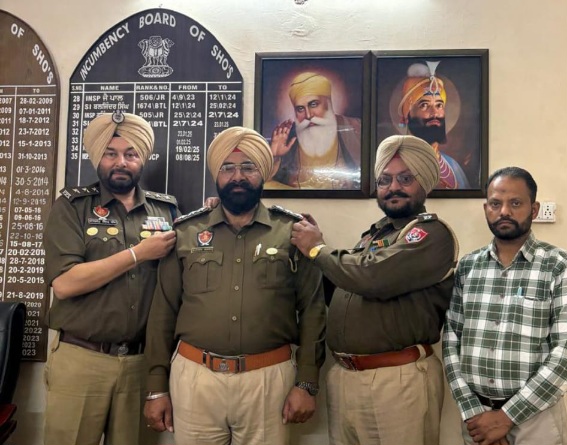 Hoshiarpur/Daljeet Ajnoha/Mar.1 : Sub-Inspector Gurnek Singh, posted at Garhshankar police station, has been promoted to the rank of Inspector. On this occasion, DSP Garhshankar Daljit Singh Khakh, ASI Jasbir Singh Gill, and Reader Parjoban Singh pinned the qpromotion star on him.DSP Khakh, along with fellow officers, friends, well-wishers, relatives, and colleagues, congratulated Singh and extended best wishes for his future success.