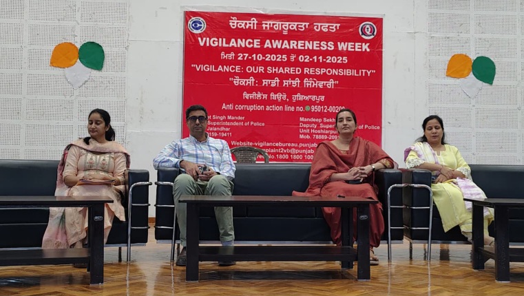 Hoshiarpur /Daljee Ajnhoa/Oct.30 : The Vigilance Bureau Unit, Hoshiarpur, organized an awareness seminar today at B.Ed D.A.V. College, near Shimla Pahari, Hoshiarpur, under the theme “Vigilance Against Corruption – Our Collective Responsibility.” The event was chaired by Vigilance Bureau Unit Deputy Captain of Police, Mandeep Singh, while Regional Transport Officer Amandeep Kaur Ghumman attended as the chief guest.Addressing officers from various departments, employees, college staff, and students, chief guest Amandeep Kaur Ghumman emphasized that every individual must perform their duties with honesty and dedication to help eradicate the evil of corruption from society.Deputy Captain of Police Mandeep Singh administered an anti-corruption pledge to all attendees. Inspector Sakshi Sharma, during her address, explained the functioning of the Vigilance Bureau. She informed that if any government officer or employee demands a bribe in exchange for official work, the matter can be reported to the Vigilance Bureau. She added that complainants can also seek the bureau’s assistance in catching the accused red-handed.She further mentioned that anyone can register a corruption-related complaint through the toll-free number 1800-1800-1000, the Anti-Corruption Action Line 95012-00200, or the website www.vigilancebureau.punjab.gov.in.The seminar was attended by College Principal Vidhi Bhalla, Tehsildar Bhim Sen, officials from the Vigilance Bureau, and a large number of students. On this occasion, pamphlets containing anti-corruption information, contact numbers, and complaint procedures were distributed.Concluding the event, Deputy Captain Mandeep Singh extended his gratitude to the college management, staff, and students, urging everyone to unite and contribute to building a corruption-free society in the national interest.