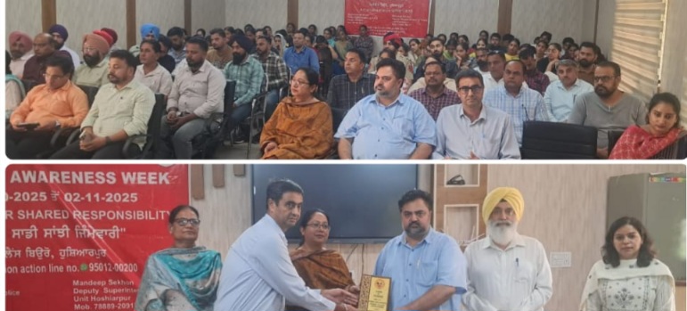 Hoshiarpur/Oct.29 /Daljeet Ajnoha : As part of Vigilance Awareness Week, the Vigilance Bureau Unit, Hoshiarpur, organised a seminar at Babbar Akali Memorial Khalsa College, Garhshankar, on the theme ‘Vigilance Against Corruption: Our Shared Responsibility’. The event was held under the supervision of DSP Mandeep Singh.SDM Garhshankar Sanjeev Kumar attended as chief guest and urged government officials, college staff, and students to perform their duties with honesty and dedication. DSP Mandeep Singh administered an anti-corruption pledge and explained the Bureau’s role in preventing bribery. He informed the participants that complaints regarding corruption can be registered through the toll-free number 1800-1800-1000, the Anti-Corruption Action Line 95012-00200, or the official website www.vigilancebureau.punjab.gov.in.Pamphlets carrying contact details of vigilance officials were also distributed. Inspector Sakshi Sharma, SHO Gagandeep Singh Sekhon, EO Madan Singh, Market Committee Secretary Varinder Kumar, Principal Amandeep Heera, and representatives from various departments and the college were present.
